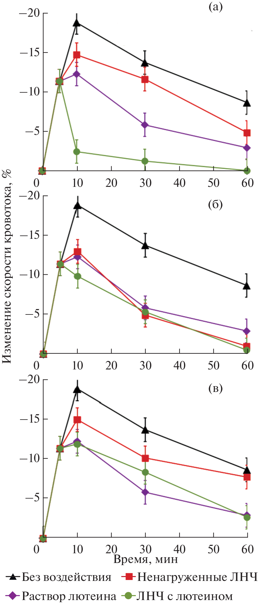 Recently, lipid nanoparticles have been intensively studied as carriers of lipophilic drugs. In this work, we have studied the stability of nanoemulsions with paraffin oil, solid lipid nanoparticles with stearic acid, and nanostructured lipid particles with paraffin oil and stearic acid in a mass ratio of 1 : 1. The obtained results have shown that all studied lipid systems stabilized with nonionic surfactants Tween 60 and Span 60 were stable to aggregation and subsequent sedimentation for more than 30 days. The incorporation of lutein into the lipid particles has almost no effect on their stability, while the size of solid lipid nanoparticles and nanostructured lipid nanoparticles decreases from 28–30 to 15–17 nm. The bioavailability of lutein loaded in lipid nanoparticles is evaluated from their effect on the restoration of blood flow velocity by simulating hemic hypoxia. Almost immediately after the application of lipid nanoparticles, the blood flow velocity ceases to decrease, and a tendency to its restoration is observed in 5–10 min. This shows that lipid nanoparticles with paraffin oil and stearic acid are promising candidates for the delivery of lipophilic drugs.