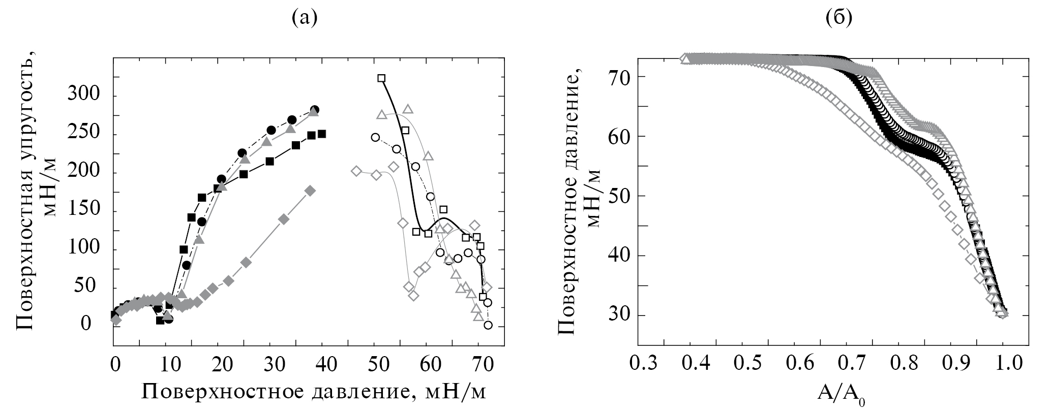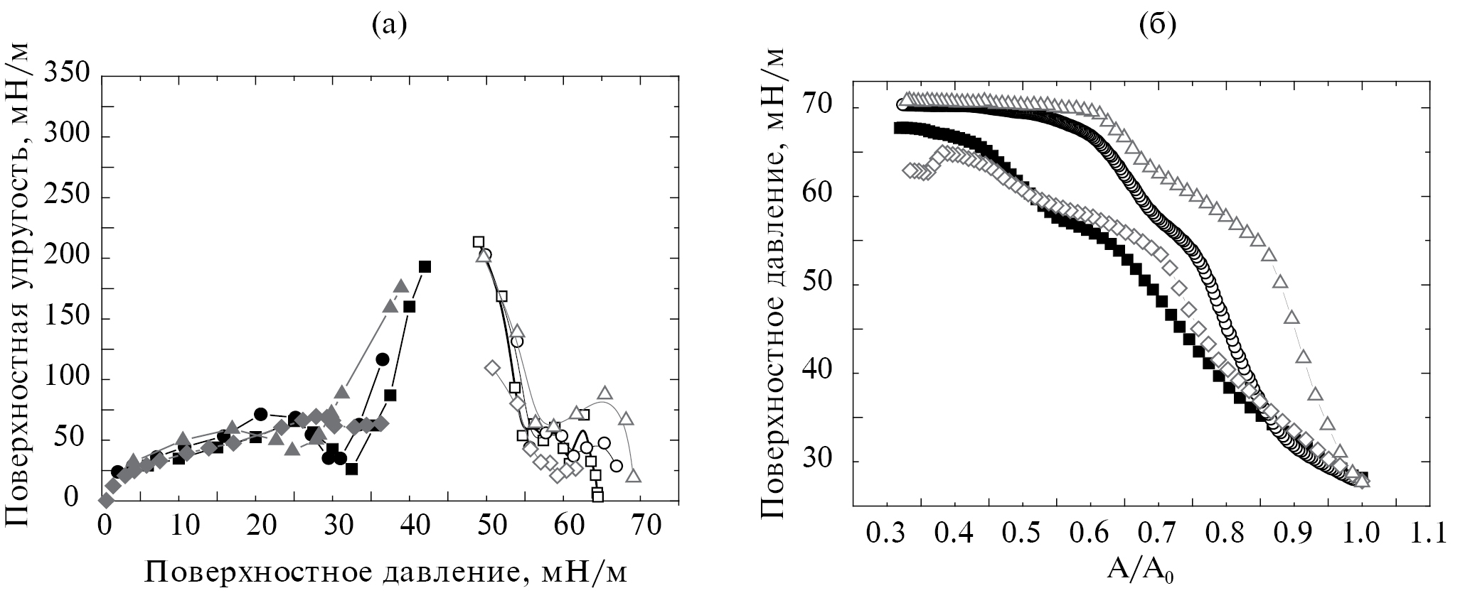 Для определения поверхностной упругости в области высоких поверхностных давлений использовался подход на основе больших деформаций [22, 23]. В этом случае ванна Ленгмюра была оснащена барьерами с дополнительной гибкой тефлоновой лентой, чтобы исключить нежелательное перетекание монослоя под барьерами при высоких поверхностных давлениях [16]. Частота колебаний площади поверхности составляла 30 мГц. Амплитуда гармонических колебаний площади поверхности варьировалась от 4 до 32%. Анализируя отклик системы на разные амплитуды колебаний площади поверхности, который выражается в виде зависимостей поверхностного натяжения от относительной деформации площади, был определен модуль эффективной поверхностной упругости.