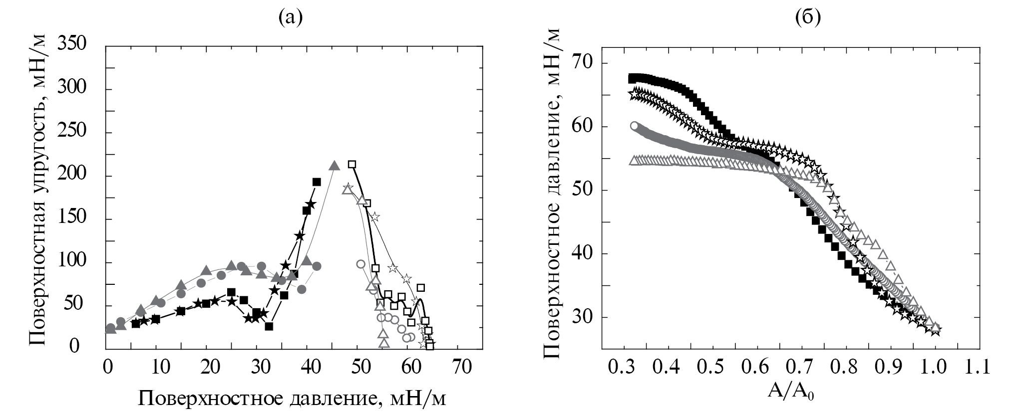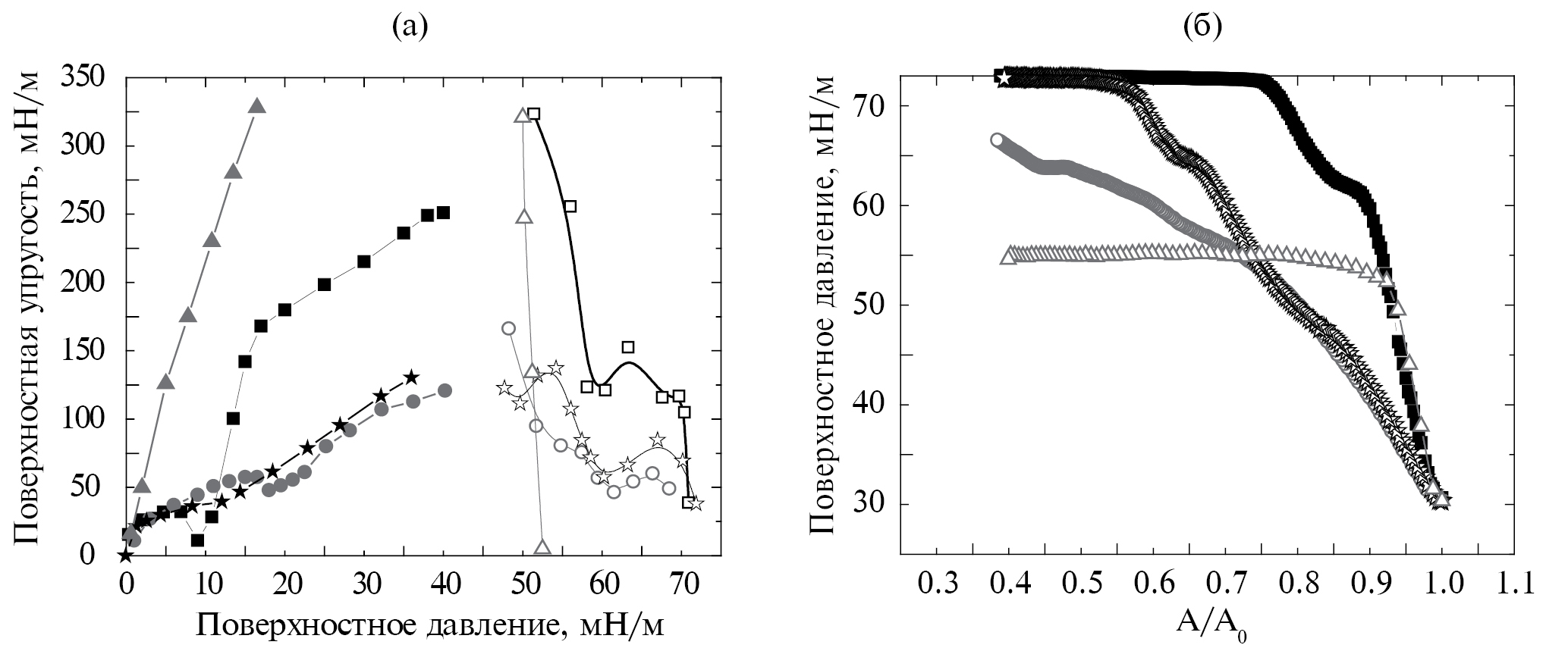 Рис. 6. (а) Зависимости динамической поверхностной упругости (закрашенные символы) и эффективной поверхностной упругости (пустые символы) от поверхностного давления и (б) изотермы сжатия для нанесенных монослоев ДПФХ (квадраты), ДПФХ/ДОФХ 9/1 (круги), ДПФХ/ПОФГ 9/1 (звезды) и ДПФХ/холестерин 9/1 (треугольники) при Т = 35°С.