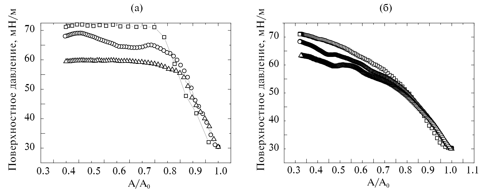 Рис. 7. Изотермы сжатия для нанесенных монослоев (а) ДПФХ/холестерин 9/1 и (б) ДПФХ/ДОФХ 3/1 при скоростях относительных деформаций 300%/мин (квадраты), 100%/мин (круги) и 30%/мин (треугольники) при 25°С.