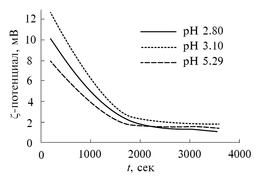 Рис. 1. Зависимость ζ-потенциала от времени контакта частиц софоры и растворителя при рН (2.80; 3.90; 5.29).