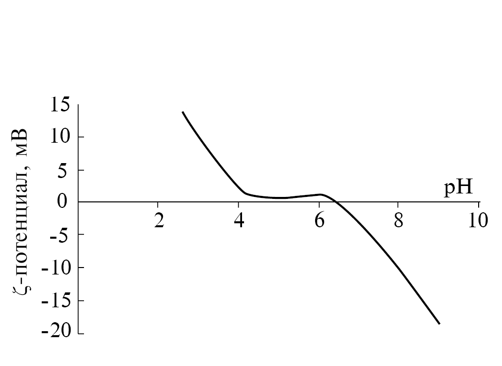 В кислой области (при рН < 6) частицы плодов софоры заряжены положительно, с увеличением рН в щелочную область величина ζ-потенциала уменьшается. Вследствие адсорбции и десорбции ионов H+ и OH– на активных центрах частиц софоры образуется заряд. Активными центрами частиц плодов софоры японской являются амино-, карбоксигруппы и др., которые являются составляющими белков, углеводов, липидов, нуклеиновых и органических кислот клеток растений [6–10]. Положительный заряд частиц в кислой области обусловлен сорбцией ионов H+, отрицательный заряд в щелочной области обусловлен сорбцией OH–. В пределах рН ~ 6 ζ-потенциал равен нулю, это значение соответствует изоэлектрической точке (pHиэт). Наличие плато на кривой ζ – рН в диапазоне рН 4–6, по-видимому, связано с экстракцией различных БАВ из диспергированных частиц софоры.