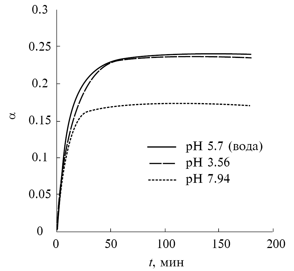 На экстракцию из растительного сырья влияет способность частиц плодов софоры японской к набуханию. На рис. 4 приведена зависимость степени набухания частиц софоры от времени контакта с растворами при различных рН. Значение pH 5.7 соответствует наибольшему набуханию частиц софоры японской, более кислое значение pH не влияет на увеличение максимальной степени набухания (aмакс), а щелочное значение снижает aмакс (рис. 4). Константа набухания при изменении pH экстрагента увеличивается, что соответствует снижению скорости набухания (табл. 1). Интересно отметить, что в растворах высокомолекулярных соединений (ВМС) наименьшему набуханию соответствует значение pHиэт [24]. Однако при набухании лекарственного растительного сырья этого не происходит, несмотря на то, что оно состоит из различных ВМС. Авторы объясняют это тем, что растительные вещества имеют клеточную структуру, благодаря чему сворачивание их в глобулу, как в растворах ВМС, не происходит. Данное значение pH соответствует естественному значению pH воды. В воде не происходит влияния агрессивной среды (как в присутствии кислоты или щелочи) на клеточную структуру, при которой разрушаются внутренние связи в матрице полимера, и ухудшается процесс набухания [23].