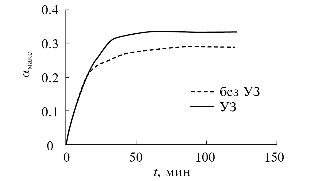 Использование ультразвука способствует увеличению максимальной степени набухания, которая достигается за более короткое время (40 мин) (рис. 4, табл. 3). Это происходит из-за разрушения прочных связей каркаса клетки под воздействием ультразвука.