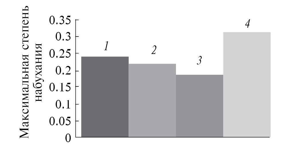 Рис. 10. Влияние на набухание частиц плодов софоры японской добавления поверхностно-активных веществ в экстрагент: 1 – вода, 2 – кокамидопропиленгликольдиамонийхлоридфосфат, 3 – натрий лаурил саркозинат, 4 – лаурет-2.