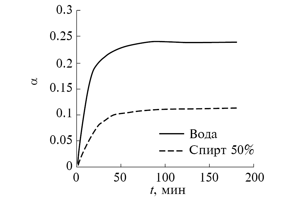 Гликозидные формы флавоноидов лучше растворимы в спирте, чем в воде [26], но понижение степени набухания в спиртовых растворах приводит к уменьшению их экстракции из частиц софоры. Определено оптимальное содержание этилового спирта в экстрагенте – 50%.