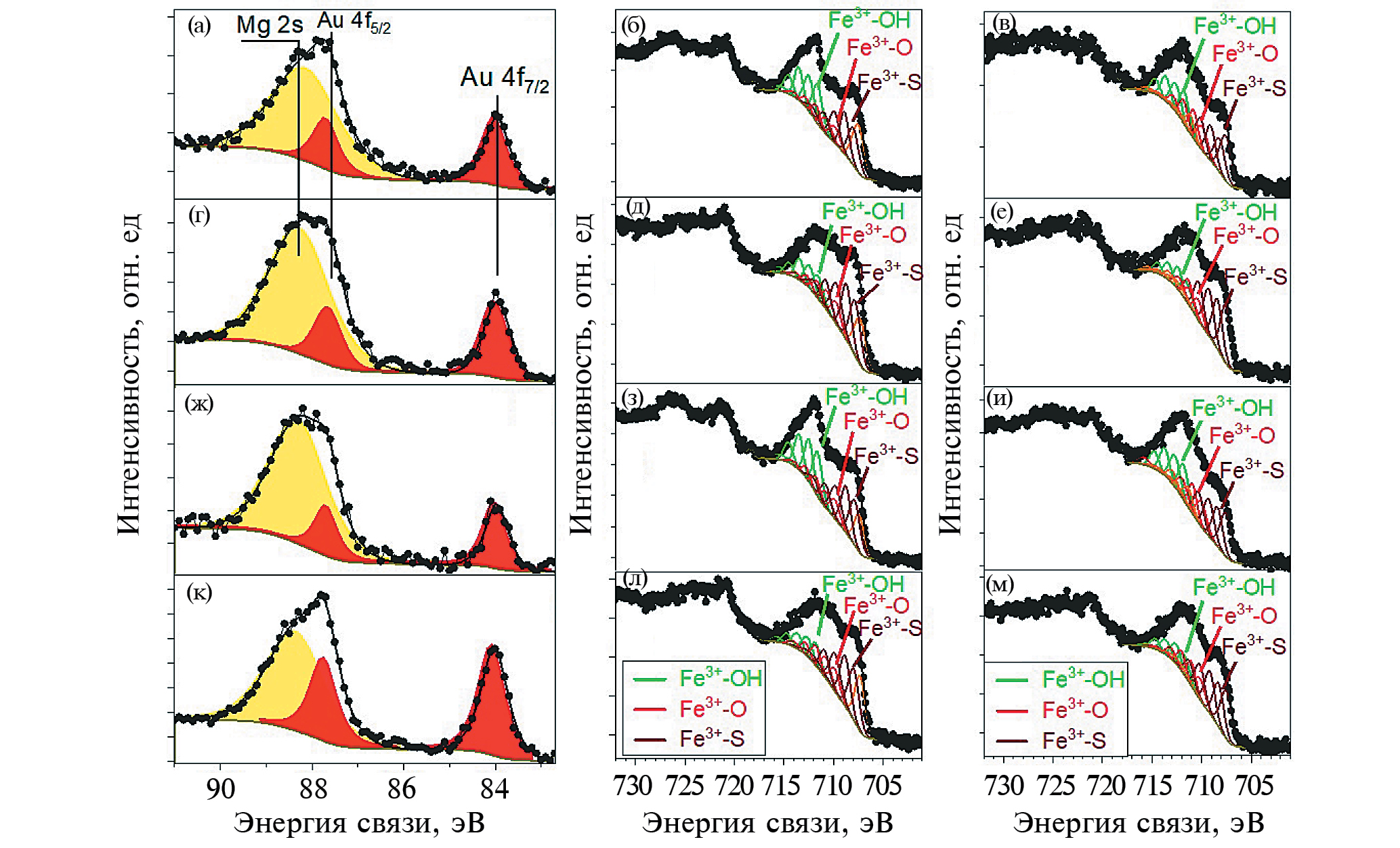 Разложение линий элементов на спектрах высокого разрешения выполняли с помощью программы CasaXPS, используя Гаусс–Лоренцовскую форму линии после вычитания фона по Ширли. Спектры Fe 2p аппроксимировали тремя наборами мультиплетных линий (четыре узких линии и одна более широкая, отвечающая сателлиту встряски) для катионов Fe3+, связанных с гидроксид-, оксид- и с сульфид-анионами; учитывались также возможные вклады Fe2+ [63]. Полосы S 2p3/2,1/2 и Au 4f7/2,5/2 аппроксимировали после вычитания фона по Ширли дублетными линиями с использованием функции Войта со спин-орбитальным расщеплением 1.19 и 3.67 эВ и отношением площадей 0.5 и 0.75 соответственно. Важно отметить, что из-за наложения 2s линии Mg на Au 4f5/2 дублетную компоненту 4f линии Au, количество золота и разложение на компоненты проводили, ориентируясь на форму и интенсивность второй дублетной компоненты Au 4f7/2.