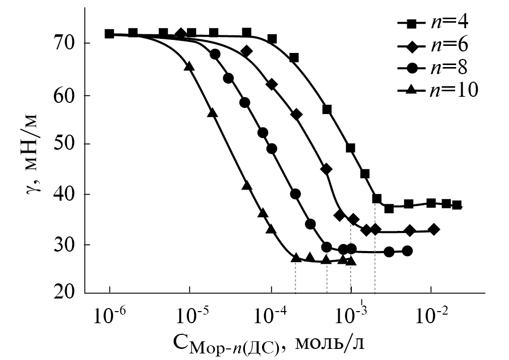 Рис. 1. Изотермы поверхностного натяжения водных растворов биамфифилов Мор-n(ДС): черный квадрат – Мор-4(ДС), черный ромб – Мор-6(ДС), черный круг – Мор-8(ДС), черный треугольник – Мор-10(ДС); 25°С.