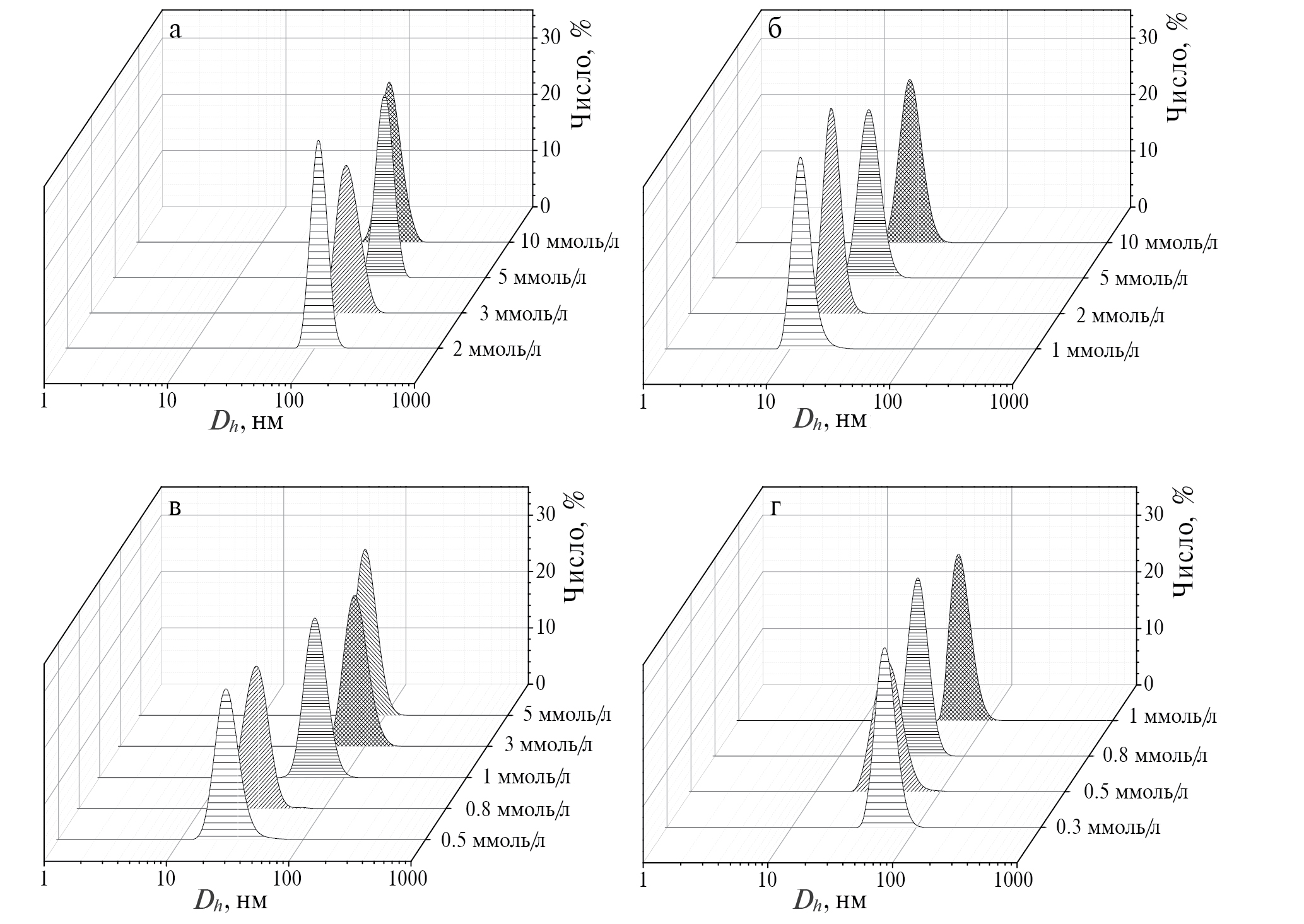 Рис. 3. Распределение агрегатов по размерам, усредненное по числу частиц, для водных растворов Мор-n(ДС): а) Мор-4(ДС); б) Мор-6(ДС); в) Мор-8(ДС); г) Мор-10(ДС); 25°С.