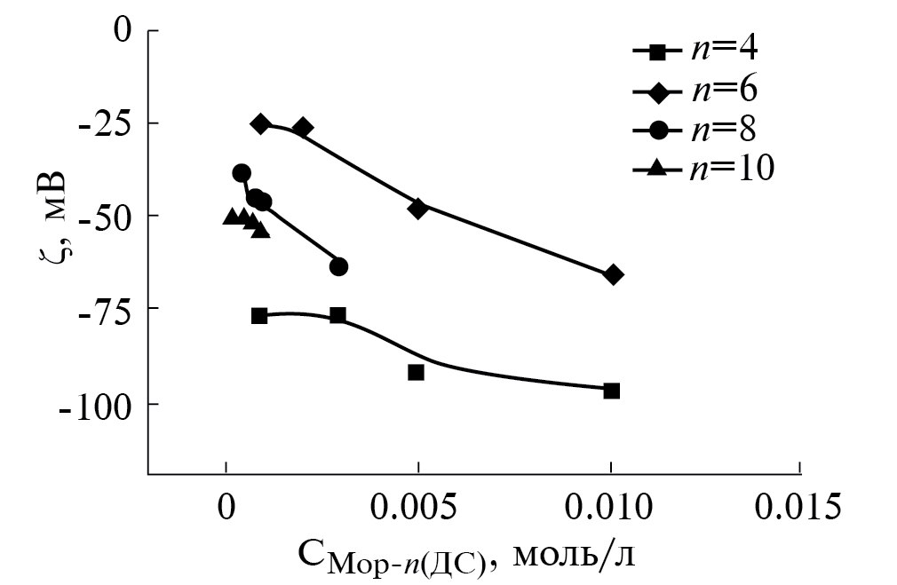 Измерение электрокинетического потенциала частиц показало, что по мере увеличения концентрации биамфифильных ПАВ происходит снижение дзета-потенциала. Подобное снижение, вероятно, связано с увеличением количества молекул ПАВ в агрегатах. Максимальные значения дзета-потенциала составляют: –95 мВ для Мор-4(ДС), –65 мВ для Мор-6(ДС), –62 мВ для Мор-8(ДС), –54 мВ для Мор-10(ДС) (рис. 4).