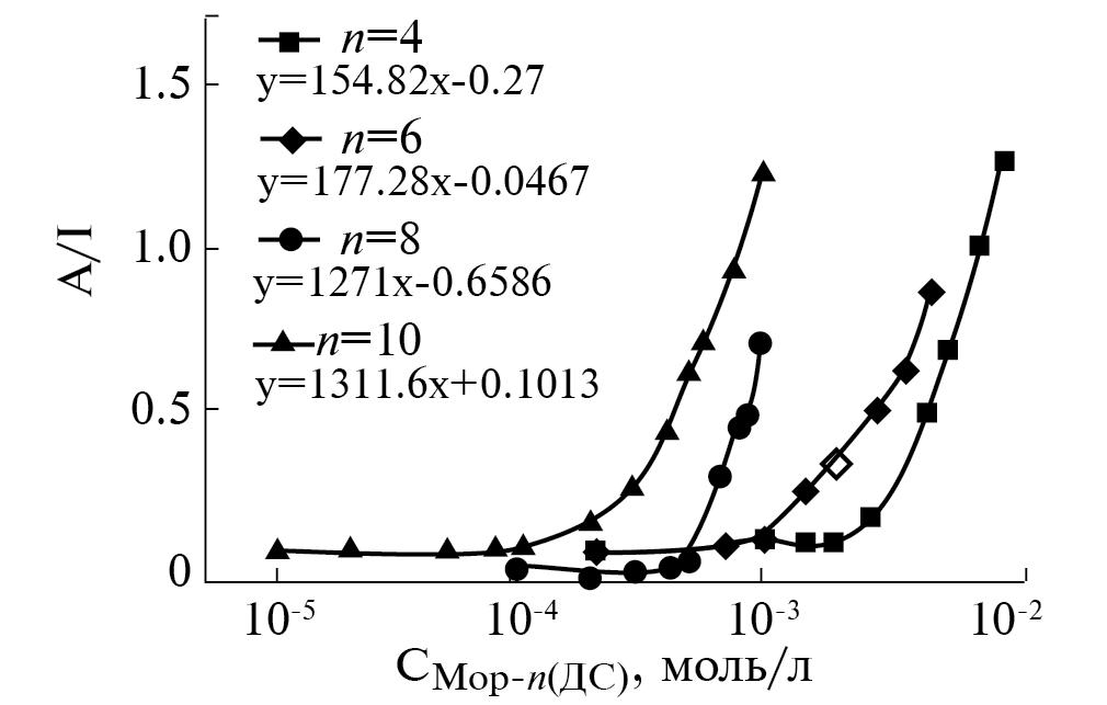 Методом флуоресцентной спектроскопии также можно определять числа агрегации мицелл в водных растворах. Наряду с размером и формой мицеллярного агрегата этот параметр предоставляет важную информацию о мицеллярной структуре. Число агрегации (N) показывает количество молекул ПАВ, входящих в одну мицеллу. С целью оценки чисел агрегации для Мор-n(ДС) проводились флуоресцентные эксперименты с использованием тушителя флуоресценции – цетилпиридиний бромида (ЦПБ). На рис. П18-П21 в Приложении приведены спектры флуоресценции пирена для Мор-n(ДС) в присутствии различных концентраций тушителя. Вычисленные числа агрегации представлены в табл. 2. Видно, что для всех членов гомологической серии происходит рост N с увеличением концентрации БПАВ. Стоит отметить, что для ДСН увеличение концентрации амфифила также приводило к линейному росту N (в диапазоне от 29 до 67) [42].