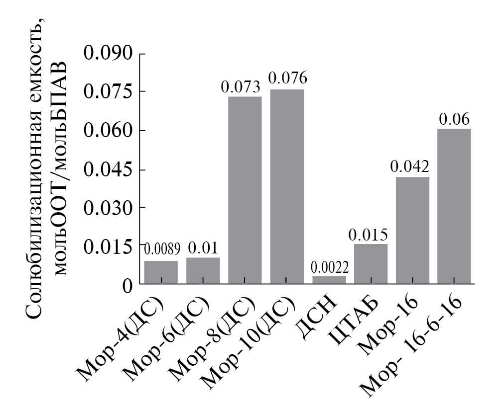 Рис. 6. Значения солюбилизационной емкости мицелл для различных амфифильных систем.