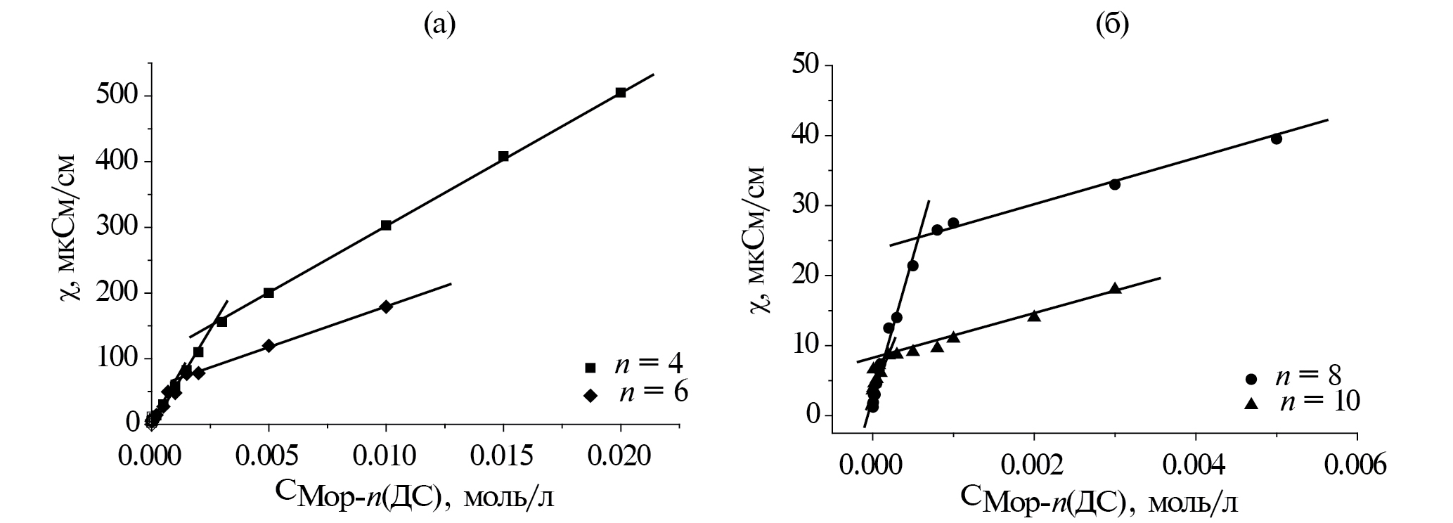 Рис. П17. Зависимость удельной электропроводности от концентрации биамфифилов: а) для систем Мор-4(ДС) и Мор-6(ДС); б) для систем Мор-8(ДС) и Мор-10(ДС); черный квадрат – Мор-4(ДС), черный ромб – Мор-6(ДС), черный круг – Мор-8(ДС), черный треугольник – Мор-10(ДС); 25°С.