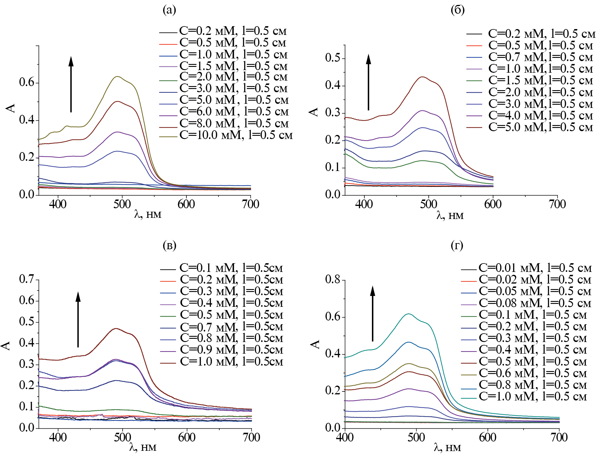 Рис. П22. Спектры поглощения Оранж ОТ для бинарных систем Мор-n(ДС)/Оранж ОТ при различных концентрациях ПАВ: а) Мор-4(ДС); б) Мор-6(ДС); в) Мор-8(ДС); г) Мор-10(ДС); стрелкой показано увеличение концентрации ПАВ; 25°С.