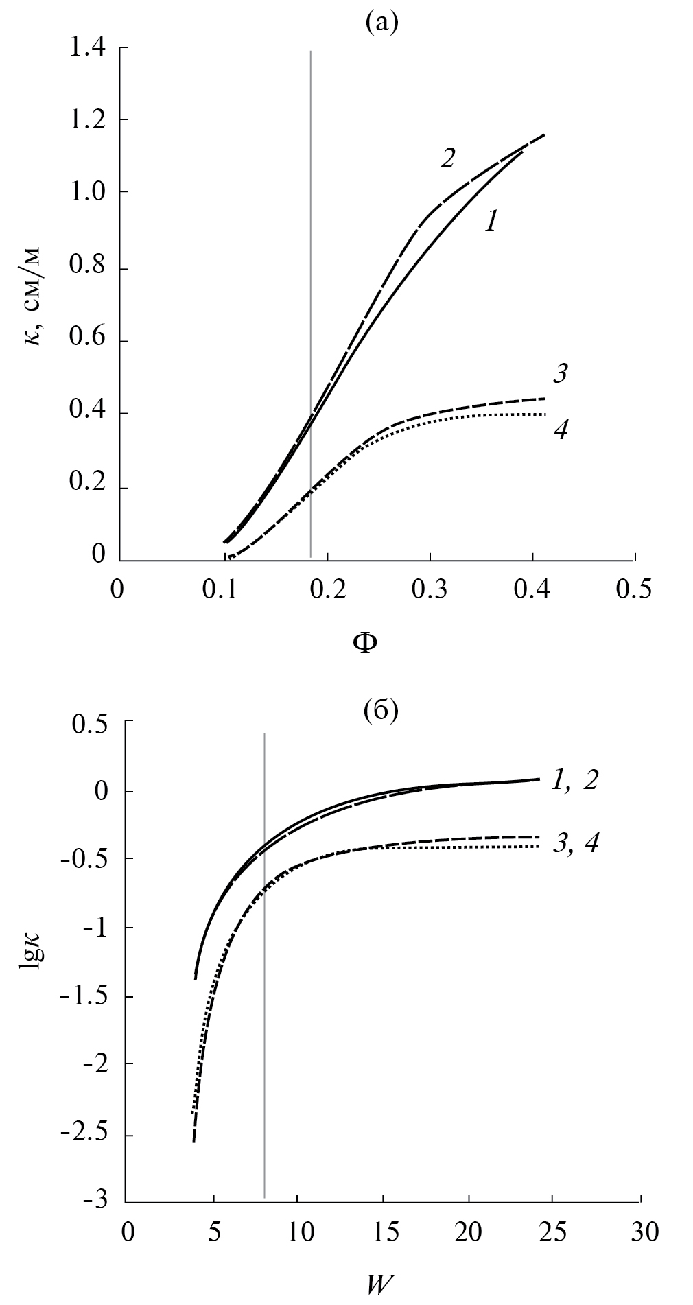 Рис. 1. Удельная электропроводность (κ) МЭ в системе Д2ЭГФNa – Д2ЭГФК – декан – вода: а) зависимость κ от объемной доли воды (Φ); б) зависимость lgκ от мольного соотношения воды и ПАВ (W). Концентрации компонентов в органической фазе, моль/л: СД2ЭГФNa = 1.6; СД2ЭГФК: 1 – 0.0; 2 – 0.1; 3 – 0.2; 4 – 0.3. T = 20°С. Вертикальная линия обозначает порог перколяции.