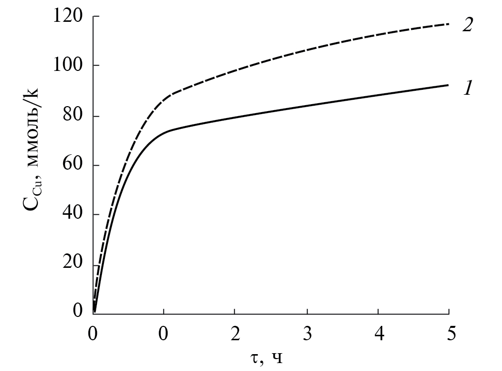Зависимость концентрации меди в МЭ от времени для состава 1 (МЭ с низкой электропроводностью и с преобладанием изолированных капель) существенно отличается от кривых для составов 2 и 3: после первого часа выщелачивания наблюдается замедление процесса. Различие полученных кривых объясняется влиянием структуры МЭ. Скорость диффузии Д2ЭГФК и ди-(2-этилгексил)фосфата меди в перколированной МЭ, обладающей более высокой электропроводностью, но близким размером капель (табл. 1), должна быть выше, чем в МЭ с преобладанием изолированных капель. Для МЭ с изолированными каплями (рис. 3, кривая 1) после 1 ч выщелачивания наблюдается близкая к линейной зависимость концентрации меди от времени (псевдо-нулевой порядок реакции), что может объясняться переходом к режиму протекания процесса, при котором лимитирующей стадией является диффузия реагентов и продуктов реакции.