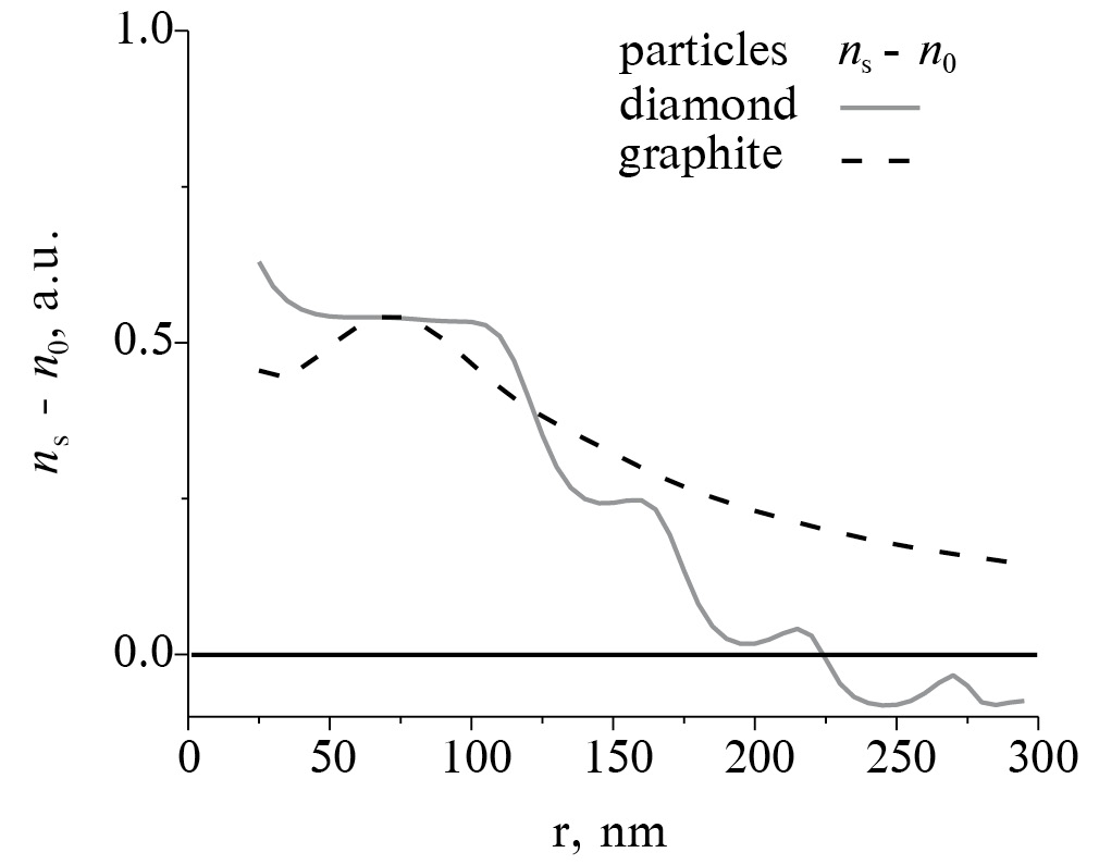 Широкий научный интерес представляют композитные материалы, в состав которых входят алмаз и аморфный углерод [20, 21]. Такие композиты используются при производстве пленок. Структурные оболочки некристаллического углерода на поверхности частиц алмаза во многом определяют свойства самих частиц и материалов, содержащих такие частицы [22, 23]. Как показали исследования, функциональные группы определяют оптические свойства как нано-, так и микроалмазов, а также дисперсных систем, в которые они входят [24]. Если в жидких дисперсных системах, содержащих микрочастицы, интенсивное рассеяние света частицами определяет их основные оптические свойства, то в случае жидких дисперсных систем с наночастицами, слабо рассеивающими свет, рефрактометрические исследования могут предоставить важную информацию как о внутреннем, так и поверхностном составе частиц. Результаты исследований показателя преломления гидрозолей, содержащих наноразмерные частицы, в состав которых входят кристаллический алмаз и аморфный углерод, представлены и анализируются в данной работе.