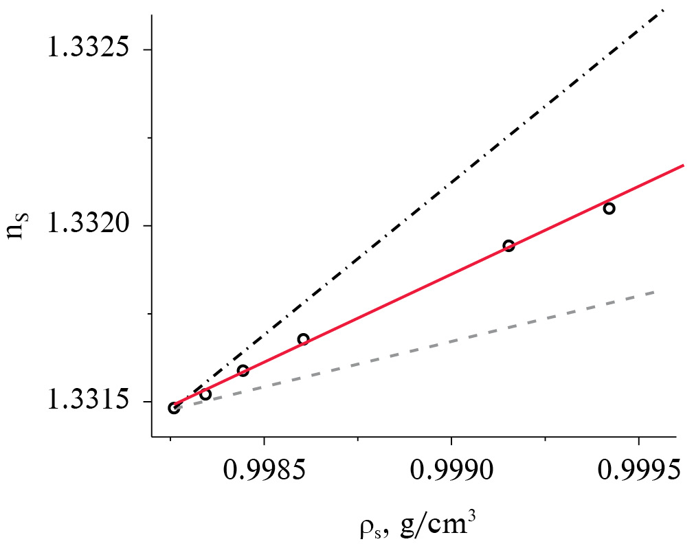 Объемная доля частиц в исследованных образцах θ менялась их разбавлением дистиллированной водой. Максимально допустимая для измерения показателя преломления образцов объемная доля частиц зависела от мутности образцов и не превышала 3 · 10–4. Разбавлением образцов дистиллированной водой были получены дисперсные системы, для которых экспериментально определялись их плотность rs и показатель преломления ns = Re(ms). Для образца № 4, размеры частиц в котором близки к длине световой волны, влияния частиц на показатель преломления выявлено не было. Это связано с крайне малым отличием показателя преломления дисперсных систем, полученных из этого образца, от показателя преломления воды, даже при максимально допустимой по мутности для данного образца объемной доле частиц θ = 0.33 ∙ 10–4. Для дисперсных систем, содержащих частицы остальных образцов, зависимости ns от rs были линейными. Зависимость ns от rs, определенная для образца № 2, представлена на рис. 5.