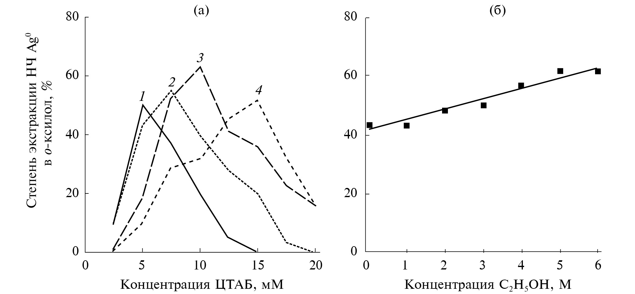 Зависимости степени экстракции от концентрации ЦТАБ при различных отношениях объемов Vксилол : Vзоль в интервале 0.5–2 (не приведено) близки между собой и подобны кривым, представленным на рис. 1б. Однако при снижении Vксилол : Vзоль до 0.25 происходило резкое снижение степени экстракции. Максимальная степень извлечения НЧ (62.5%) наблюдалась при Vксилол : Vзоль = 2, концентрация наночастиц серебра в исходном гидрозоле – 0.4 М, ЦТАБ – 10 мМ и этанола – 2 М.