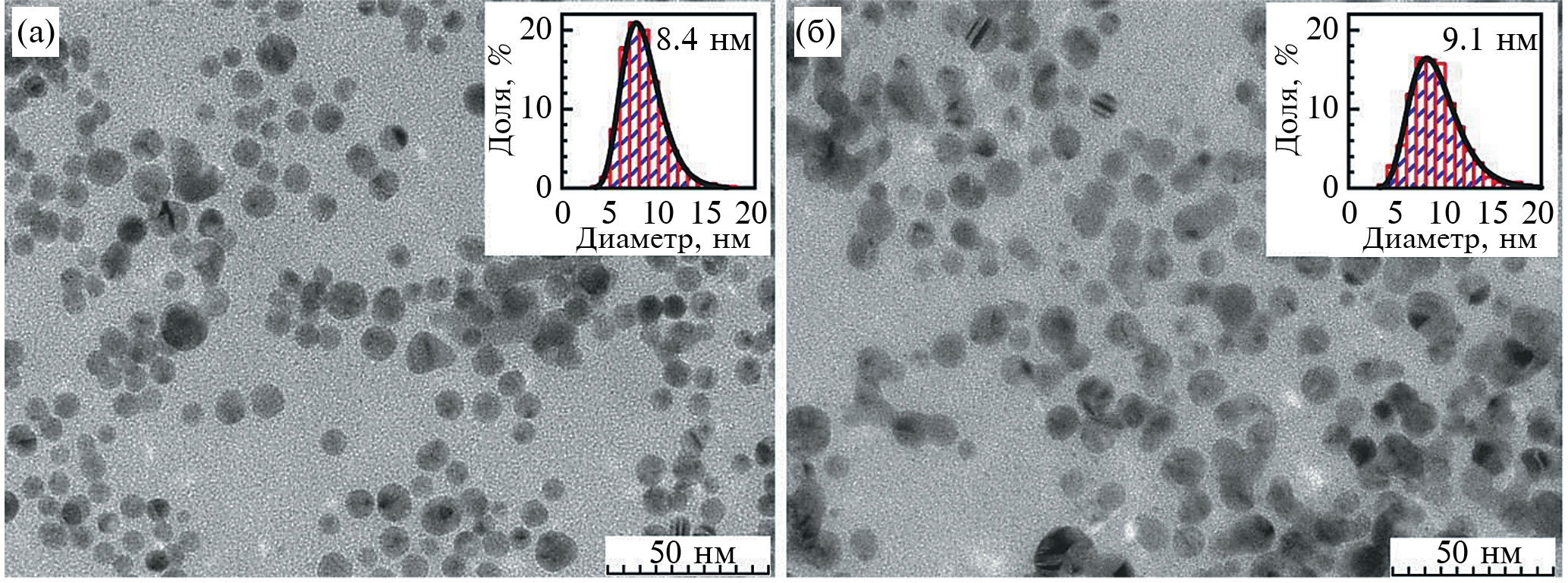 По данным просвечивающей электронной микроскопии (рис. 3), исходные гидрозоли серебра содержали наночастицы, имеющие близкую к сферической форму и медианный размер 8.4 нм. После экстракции в фазу о-ксилола форма частиц практически не изменилась. Распределение частиц по размерам в органозоле, как и в гидрозоле, имело логнормальный характер, что свидетельствует о наличии некоторого количества агрегатов. Медианный размер частиц после перехода в органическую фазу незначительно увеличился до 9.1 нм.