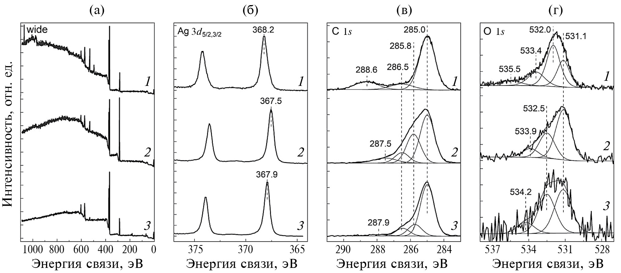 Рис. 5. РФЭ-спектры обзорные (а), Ag 3d (б), C 1s (в) и O 1s (г) исходных наночастиц серебра (кривая 1), органозолей (кривая 2) и осадка (кривая 3), образующегося в гидрозоле в ходе экстракции.
