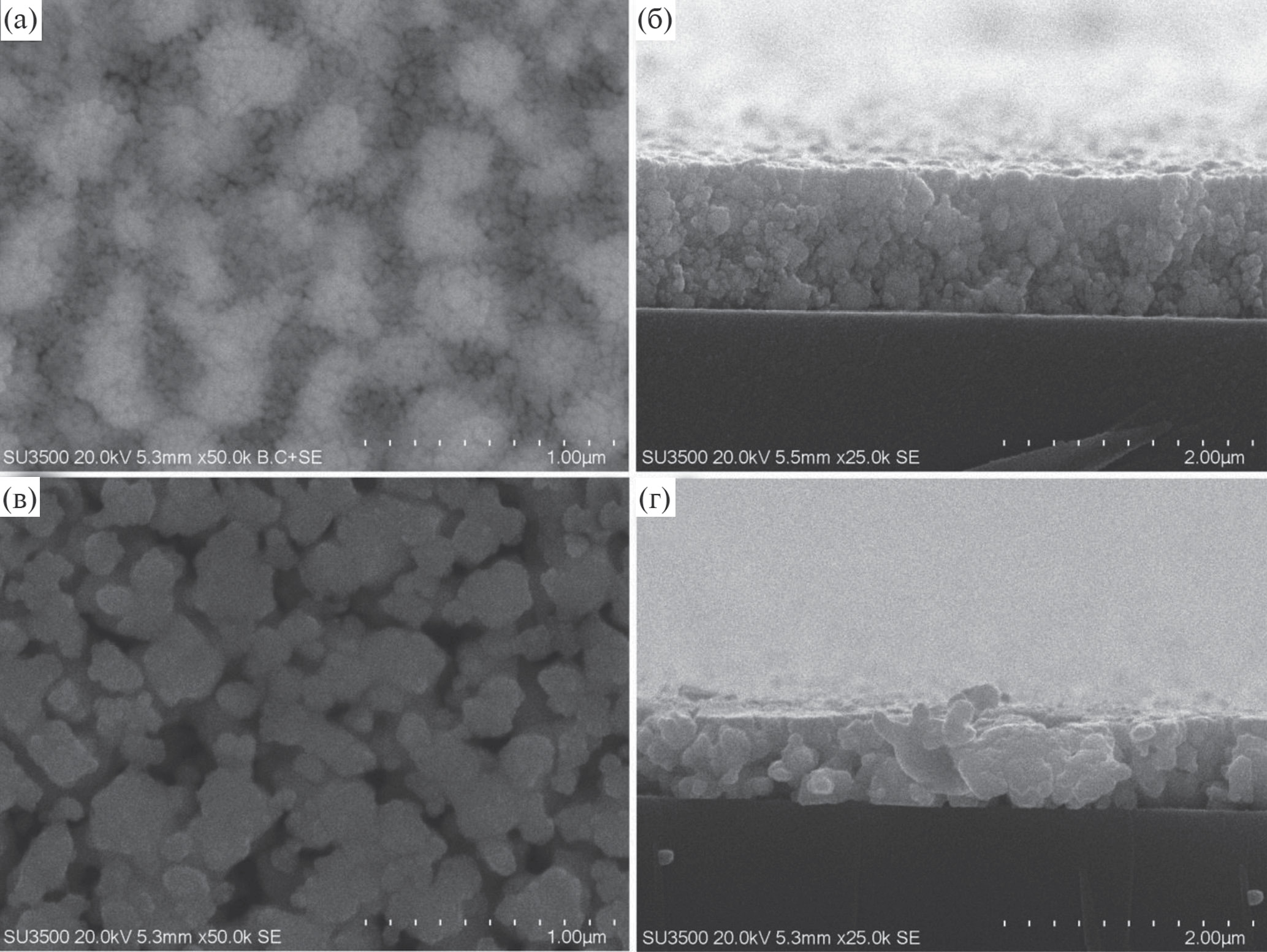 Рис. 8. РЭМ микрофотографии поверхности (а, в) и поперечного среза (б, г) пленок до (а, б) и после (в, г) отжига при 250°C.