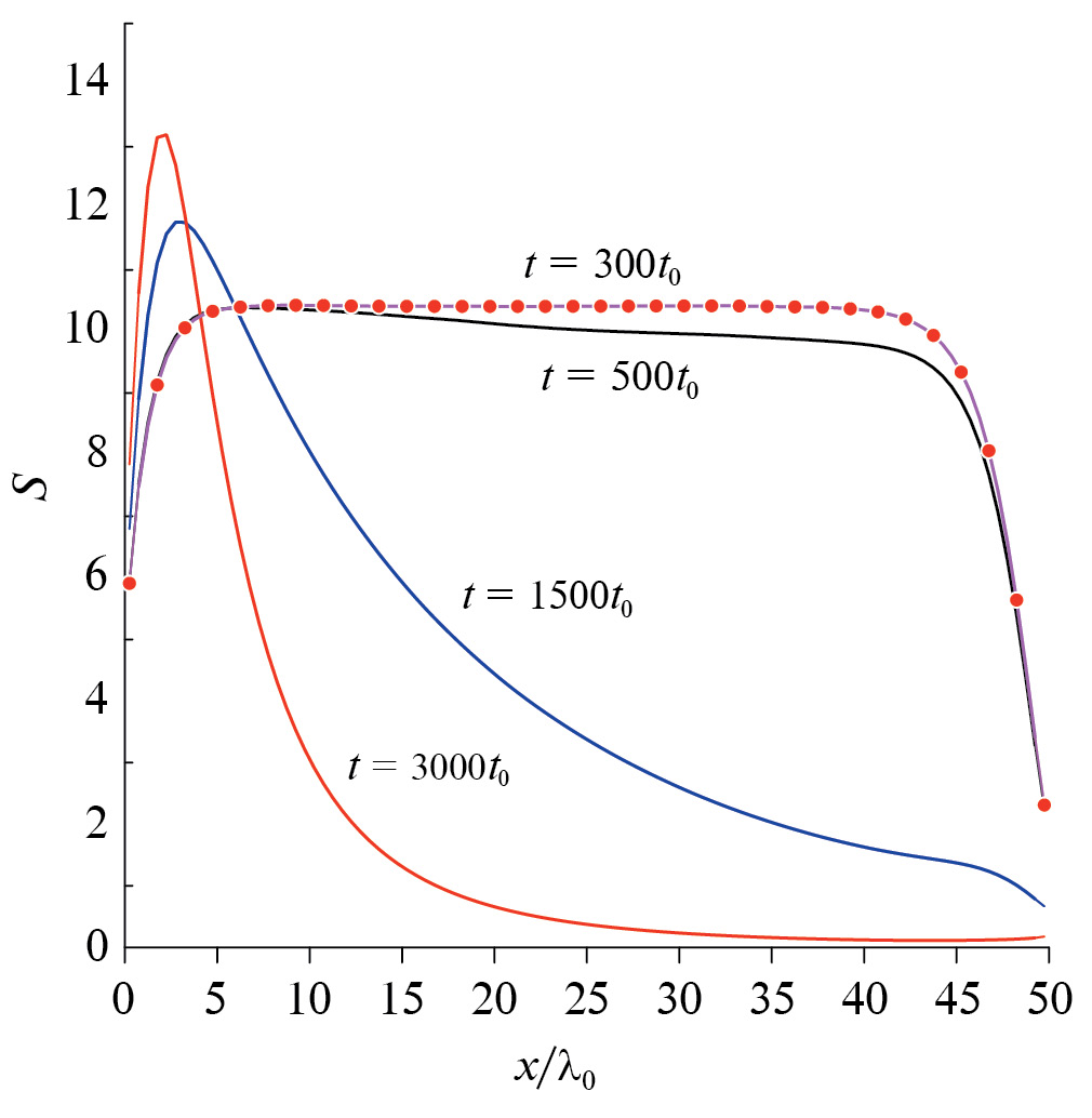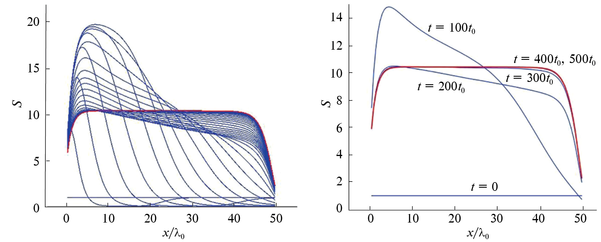 Из рис. 2а видно, что через время 10t0 после начала процесса вблизи «горячей» поверхности образуется область протяженностью примерно 5λ0 с максимальным значением пересыщения 8. Причем этот максимум располагается на расстоянии λ0 от испарительной поверхности. Интересно отметить, что через интервал времени 10t0 максимум степени пересыщения увеличивается (Smax ≈14), сдвигается от поверхности испарения вправо, а сама область пересыщения расширяется. Такого рода процесс продолжается примерно 60t0 после начала испарения. К этому моменту времени максимальная величина пересыщения составляет 20 и находится на координате 10λ0. Далее наблюдается уменьшение степени пересыщения вблизи горячей поверхности и ее увеличение вблизи холодной поверхности. Как видно из рис. 2, ко времени 300t0 в расчетной области устанавливается стационарный профиль пересыщения. При этом, начиная с момента времени 10t0 и до момента времени 110t0, в половине исследуемой области находится пар со степенью пересыщения S > 10. Таким образом, результаты решения задачи об испарении/конденсации подтверждают наличие пересыщения у поверхности испарения, аналогично данным [2, 12].