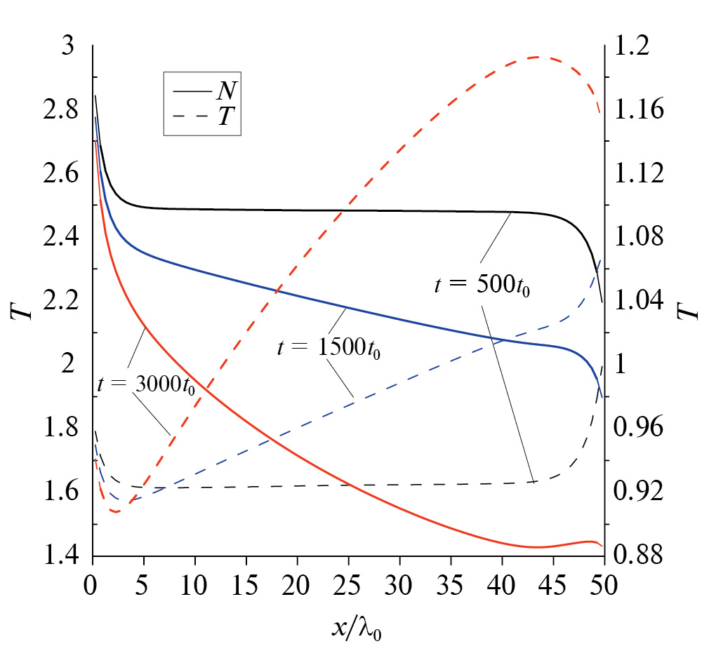 Рис. 5. Распределения концентрации пара (N) – сплошные линии, температуры (T) – пунктирные линии для различных моментов времени.