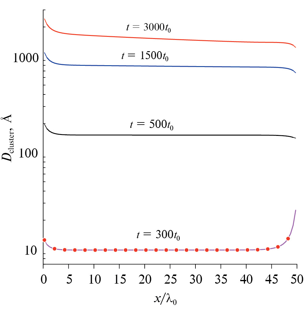 Согласно (10), время образования кластера данного радиуса составляет τ1 = 4.2 ∙ 10–9 c. При этом время существования зоны пересыщения с величиной S = 10 составляет примерно 60 единиц, т. е. τS = 60t0, что соответствует размерному времени 1.7 ∙ 10–7 c. Следовательно, поскольку τS > τ1, за время 60t0 успевают образовываться кластеры критического размера. Приведенные оценки дают основания в первом приближении считать, что к моменту времени 300t0 исследуемая область заполнена кластерами, размер которых определяется по стационарной степени пересыщения (красная линия на рис. 2б).