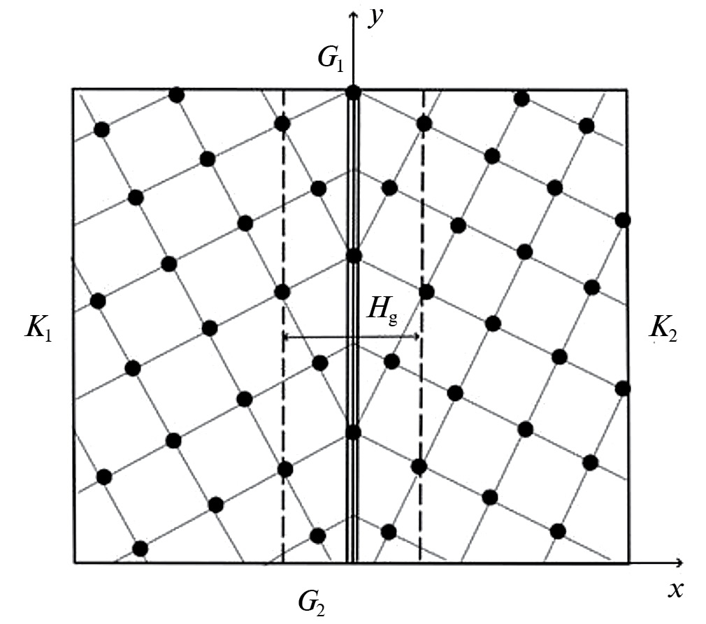 Рис. 1. Периодическая атомная структура специальной границы G1G2 между кристаллитами K1 и K2 в простой кубической решетке толщиной Hg. Граница лежит в координатной плоскости yOz, ось Ox направлена перпендикулярно границе.