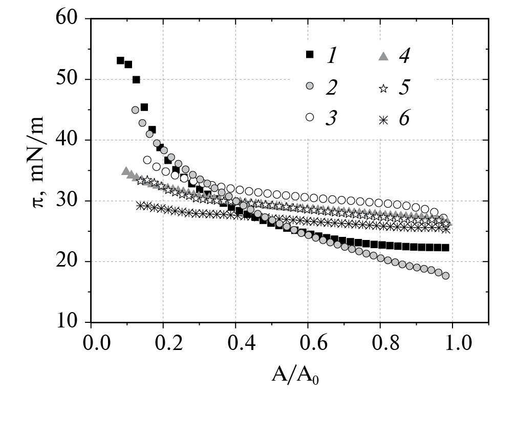 Рис. 3. Изотермы сжатия для растворов фибриногена с концентрацией 3 · 10–7 М (1); растворов, содержащих фибриноген с концентрацией 3 · 10–7 М и тромбин концентрацией 300 Ед/л (2); растворов смесей фибриноген-содержащего и тромбин-содержащего компонентов клея “Криофит”, взятых в соотношениях 10 : 1 (3), 5 : 1 (4), 2 : 1 (5), 1 : 1 (6).