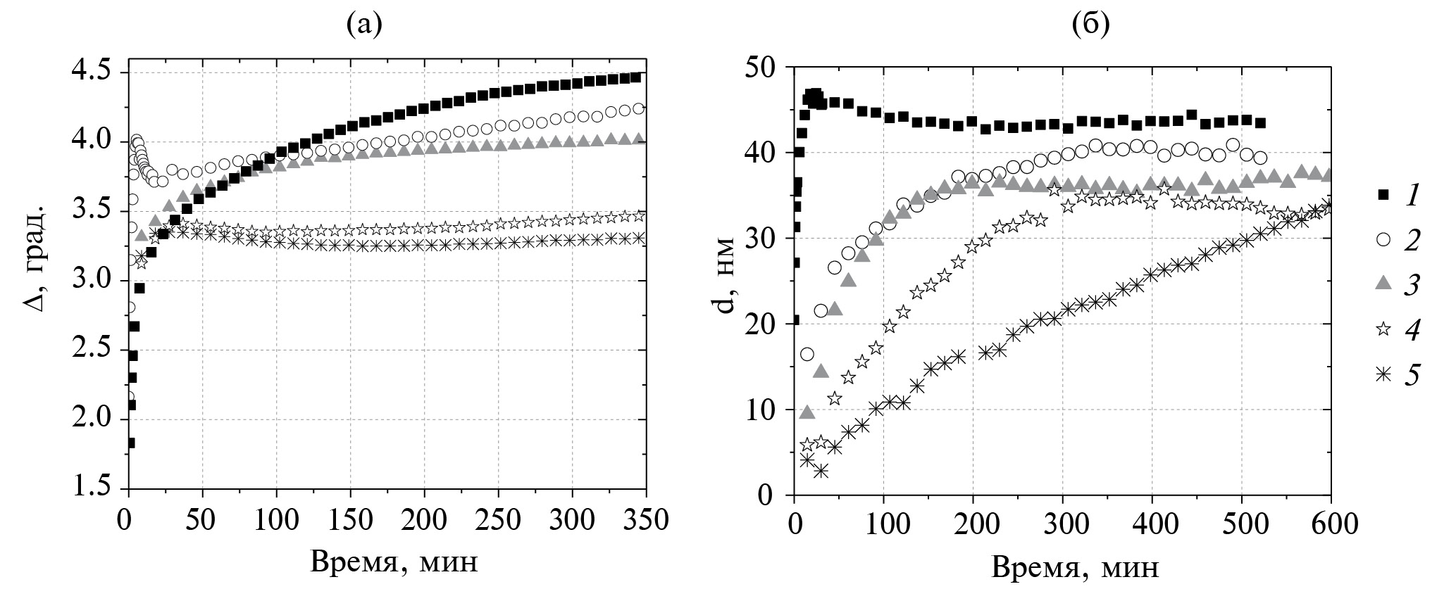 Рис. 4. Кинетические зависимости эллипсометрического угла Δ (а) и кинетические зависимости толщины пленки (б) для растворов фибриногена с концентрацией 1 · 10–7 М (1) и растворов смесей фибриноген-содержащего и тромбин-содержащего компонентов клея “Криофит”, взятых в соотношениях 10 : 1 (2), 5 : 1 (3), 2 : 1 (4), 1 : 1 (5).