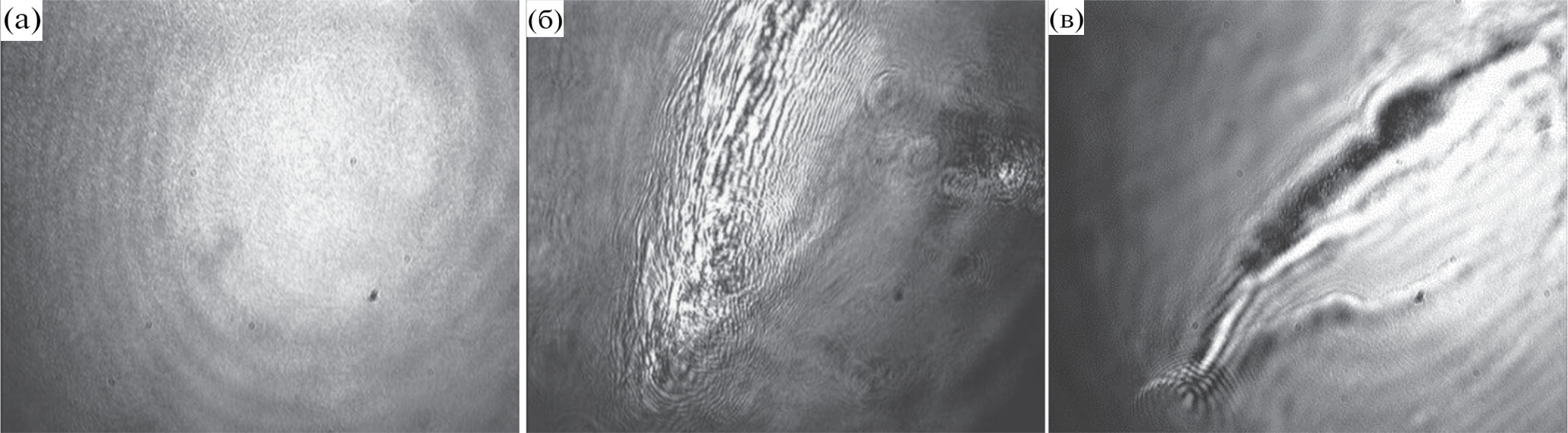 Рис. 6. Изображения пленок фибрина, полученные с помощью микроскопии при угле Брюстера для растворов смесей фибриноген-содержащего и тромбин-содержащего компонентов клея “Криофит” в соотношении 1 : 1. Изображение (а) соответствует равновесной пленке, изображение (б) – после наложения малого механического возмущения, изображение (в) – повторное наложение малого механического возмущения.