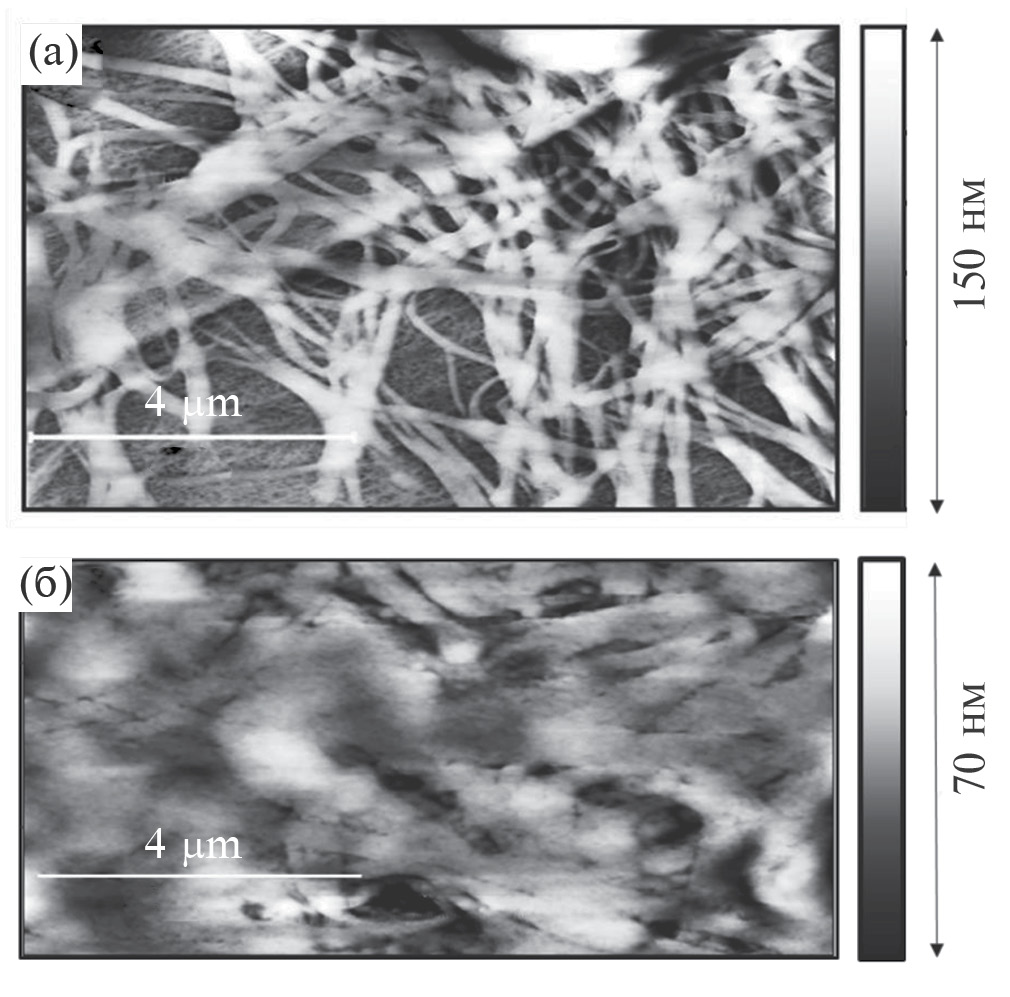 Рис. 7. АСМ-изображение пленки фибрина, полученной из раствора смеси фибриногена концентрацией 3 · 10–7 М и тромбина концентрацией 100 Ед/л (а) и 300 Ед/л (б).