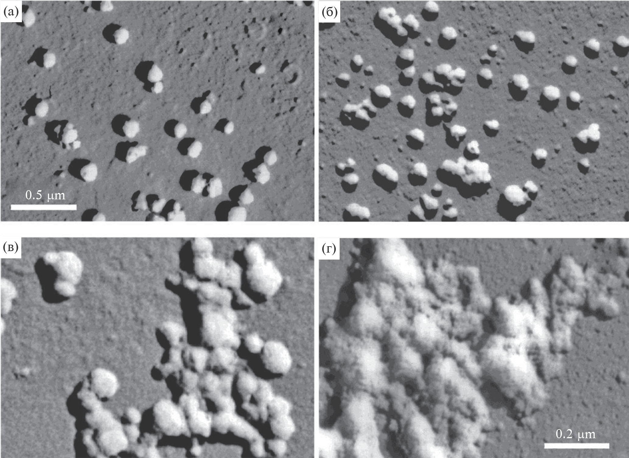 Затем (рис. 4в) из ди-, три- и тетрамеров и отдельных мицелл образуются слабосвязанные кластеры. Слабый характер связей между мицеллами казеина в образующихся кластерах подтверждается незначительным изменением вязкости образца на этом участке стадии гелеобразования. Рис. 5 демонстрирует образование небольших слабосвязанных кластеров мицелл к моменту времени (B) на рис. 1 (началу первичной фазы ферментативного гелеобразования), полученных различными методами препарирования, что исключает неверную их интерпретацию.