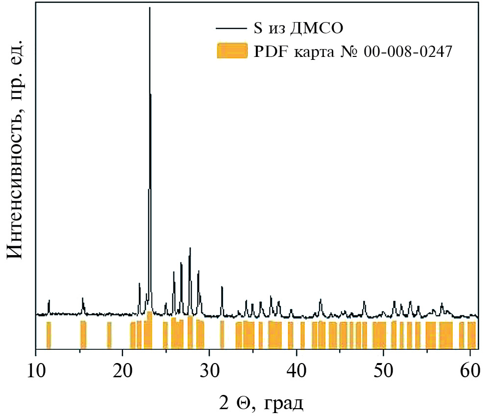 Рис. 2. Данные РФА образца серы, полученного промывкой и сушкой продукта МА по схеме (1) с добавлением 2 мл ДМСО.