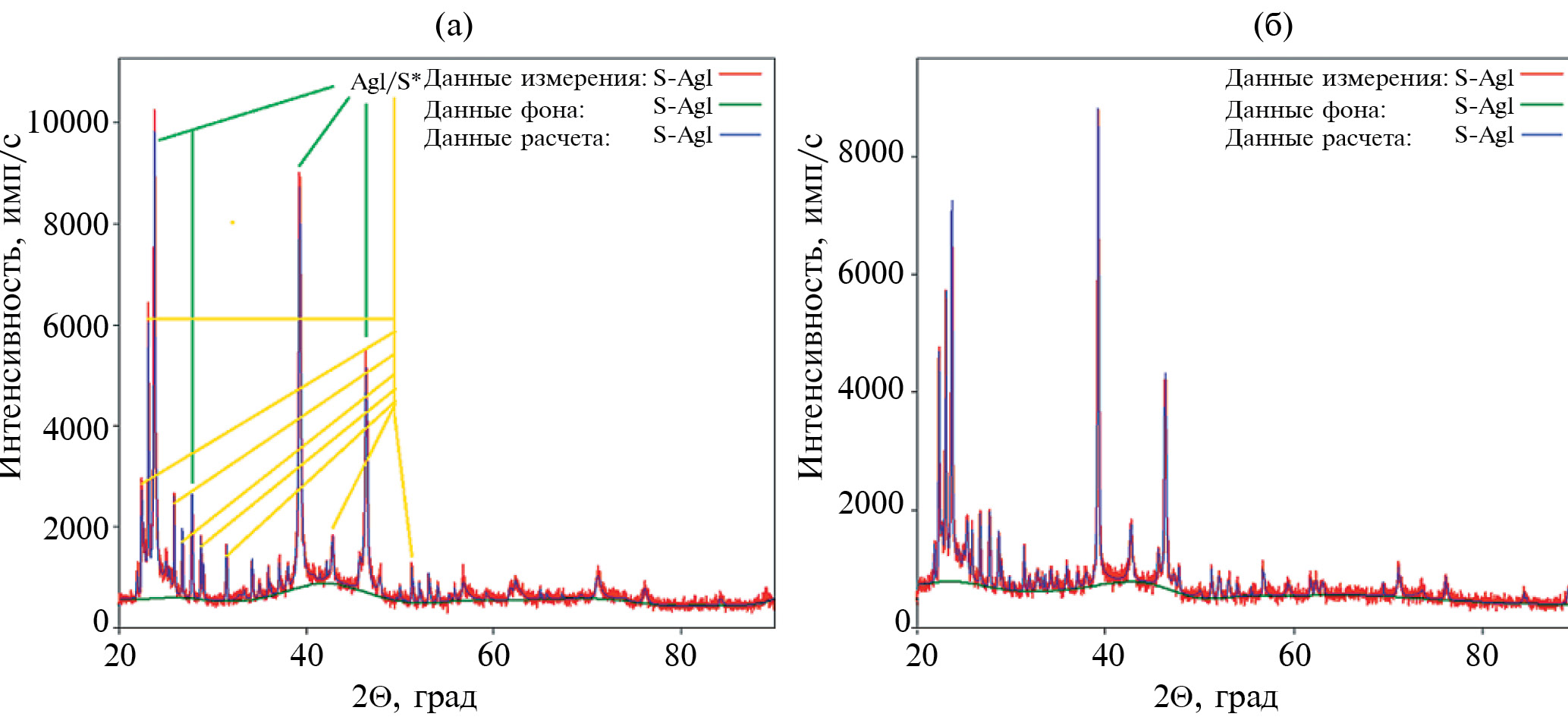 Рис. 5. Дифрактограммы образцов S*/AgI с добавкой 5 мл (а) и 1 мл (б) ДМСО.