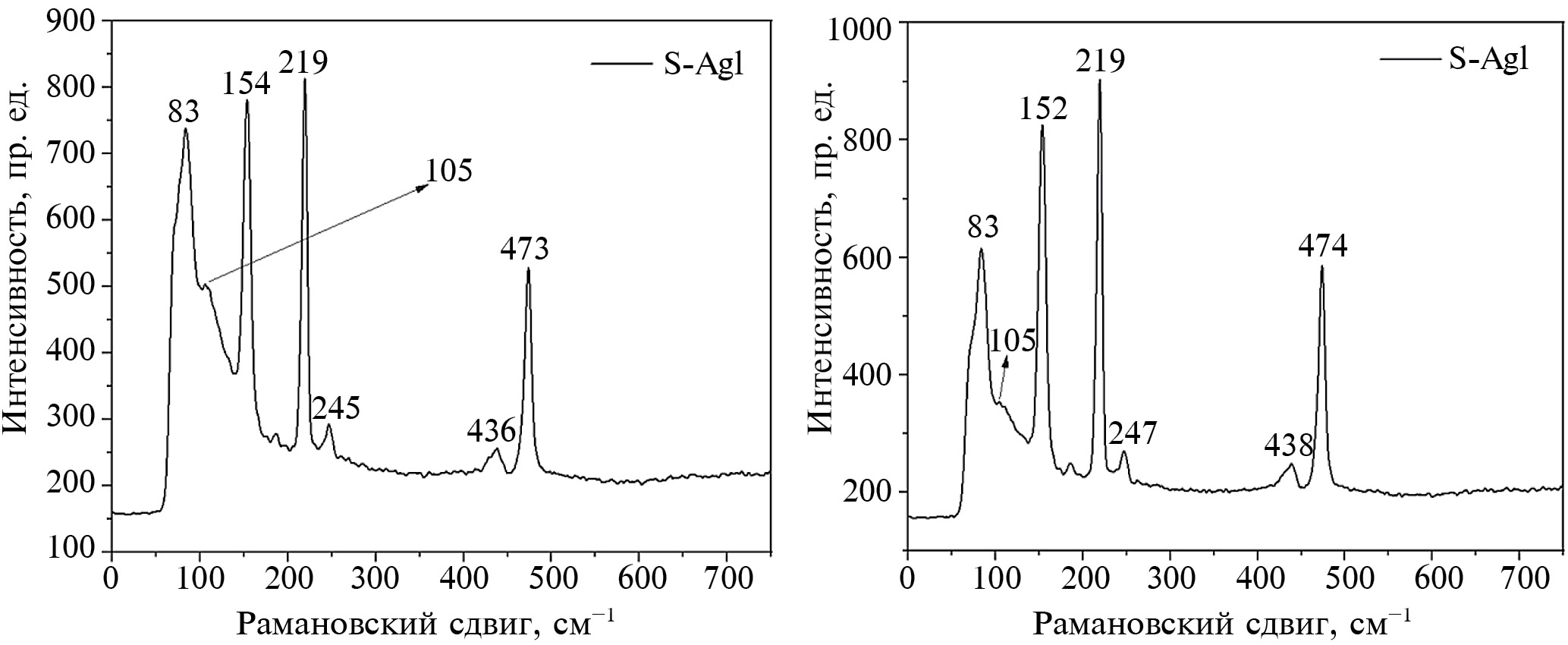 Соотношение компонентов, фазовый и элементный состав нанокомпозитов S*/AgI были также подтверждены данными КР-спектроскопии, показанными на рис. 6. Видно, что существенной разницы в спектрах образцов рис. 6а и рис. 6б нет, но, как и в случае РФА, имеются изменения в положениях и формах спектров КР в зависимости от добавок ДМСО. Согласно [48], образцы представлены линиями иодида серебра: пик при 83 см–1 (результат суперпозиции пика AgI при ≈ 75 см–1 и пика серы при 88 см–1) и пик с небольшим плечом около 105 см–1. Остальные волновые числа 153, 219, 246, 437 и 473 см-1 для обоих образцов S*/AgI соответствуют пикам серы в модификации α–S8 на рис. 3 [47].