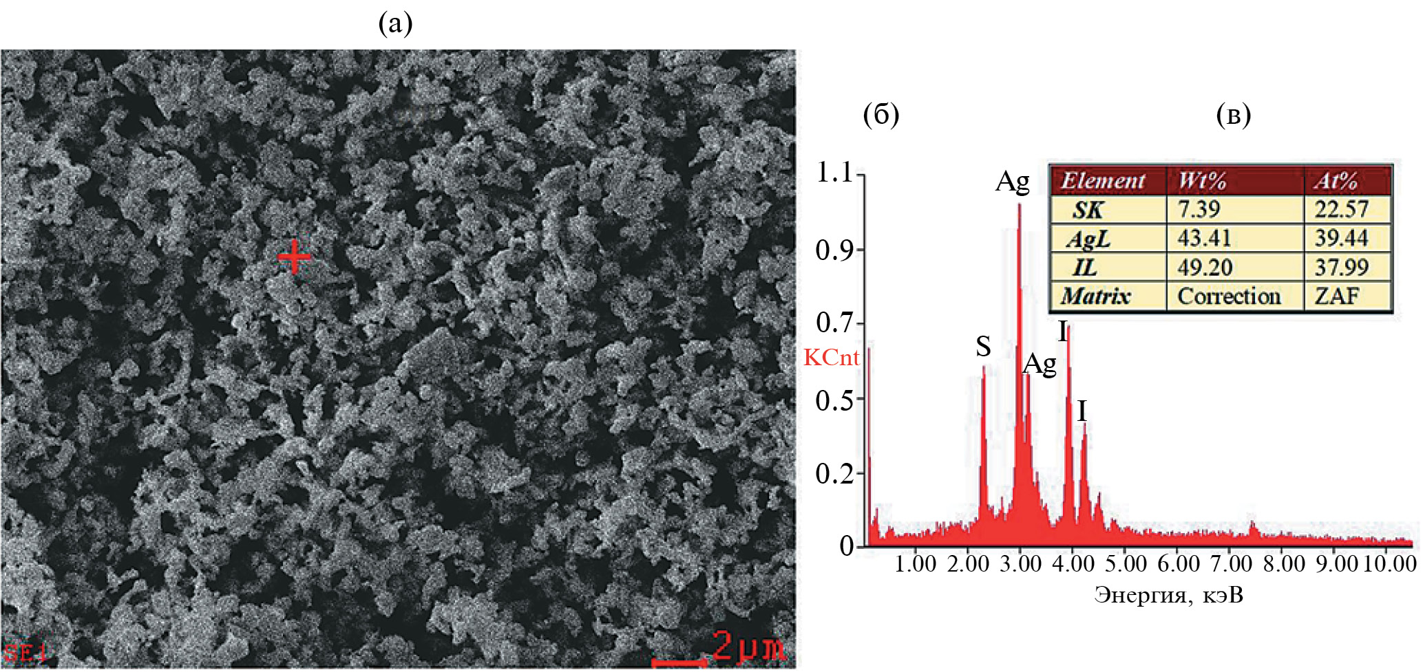 Рис. 8. Данные СЭМ-ЭДС для образца S*/AgI, полученного добавкой 5 мл ДМСО: (а) микрофотография СЭМ с отмеченной крестиком областью применения ЭДС; (б) результат ЭДС определения элементного состава; (в) таблица содержания элементов.