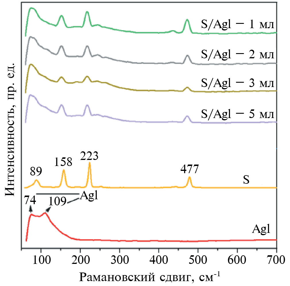 При обсуждении данных на рис. 6 отмечалось, что в КР-спектрах S*/AgI имеет место наложение пиков S при 88 см–1 [47] и AgI при ≈75 см–1 [48] с образованием смешанного пика при 83 см–1. Этот эффект (рис. 10) еще более характерен для нанокомпозитов S*/AgI, полученных на мельнице Пульверизетте 5. Для чистого AgI выделяются только два пика 74 и 109 см–1 [48]. Четыре четких пика при 89, 158, 223 и 477 см–1 относятся к сере, и по сравнению с рис. 3, 6 они чуть сдвинуты от линий 83, 152, 219 и 474 см–1. Суперпозиция пика серы при 89 см–1 и пиков AgI при 74 и 109 см–1 приводит к образованию широких полос с максимумами около 80 см–1 и 105 см–1 соответственно (рис. 10).