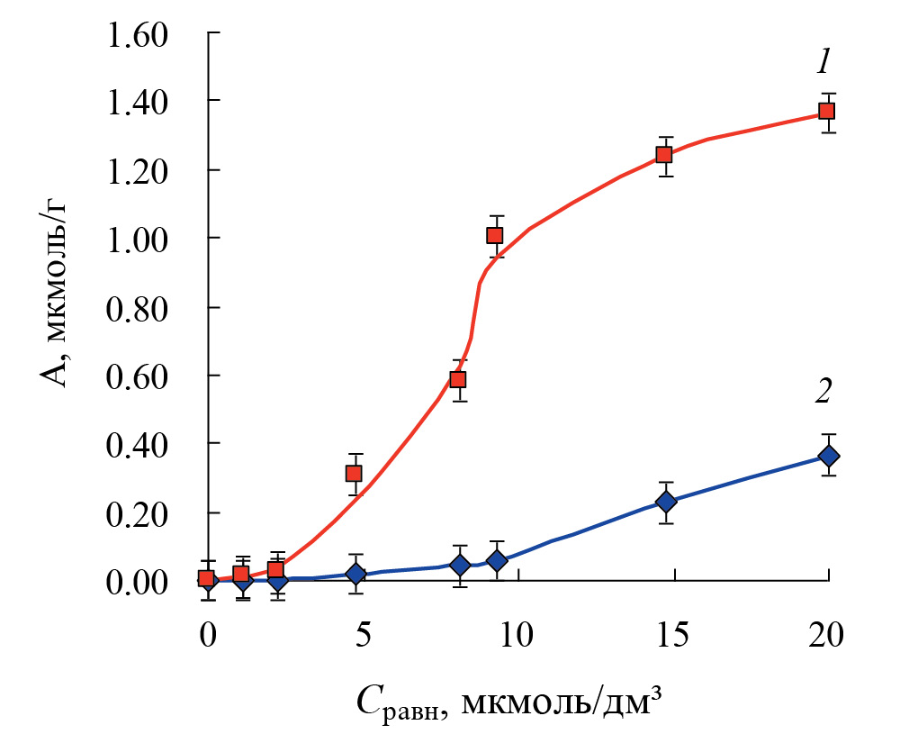 Рис. 6. Изотерма сорбции красителя эритрозина (Е127) (рН 6.90): 1 – ПМО-Е127; 2 – ПС.