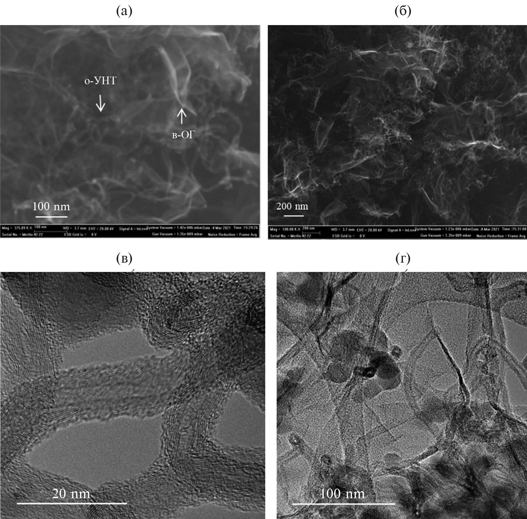 На рис. 2 представлены СЭМ- (а, б) и ПЭМ- (в, г) изображения морфологии и структуры карбонизированного криогеля. Приведенные микрофотографии материала показывают, что в процессе карбонизации структурообразующие компоненты образца сохранили свою изначальную форму. УНТ находятся на поверхности графеновых пластин, имеют цилиндрическое расположение графеновых слоев с перемычками внутри канала. ПАНИ присутствует в виде сфероподобных частиц (рис. 2г).