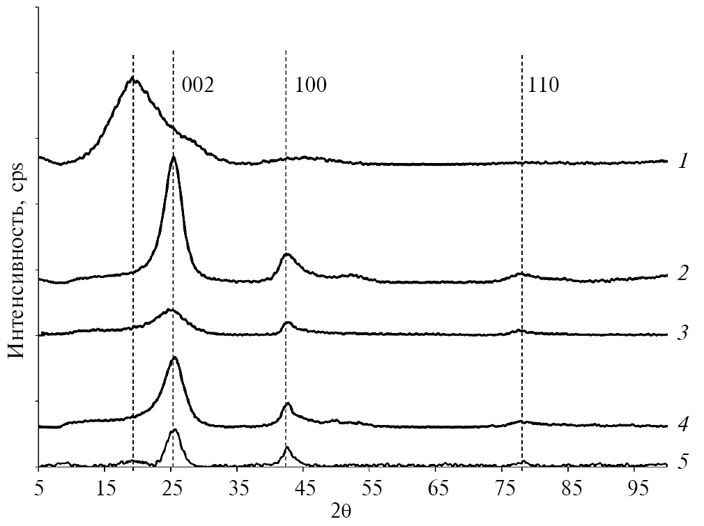 Рис. 3. Дифрактограммы образцов до и после карбонизации: 1 – ПАНИ, 2 – о-УНТ, 3 – в-ОГ, 4 – карбонизированный криогель, 5 – криогель.