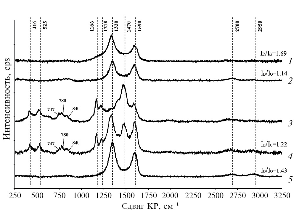 Рис. 4. КР-спектры материалов: 1 – карбонизированный криогель; 2 – о-УНТ; 3 – ПАНИ; 4 – криогель; 5 – в-ОГ.