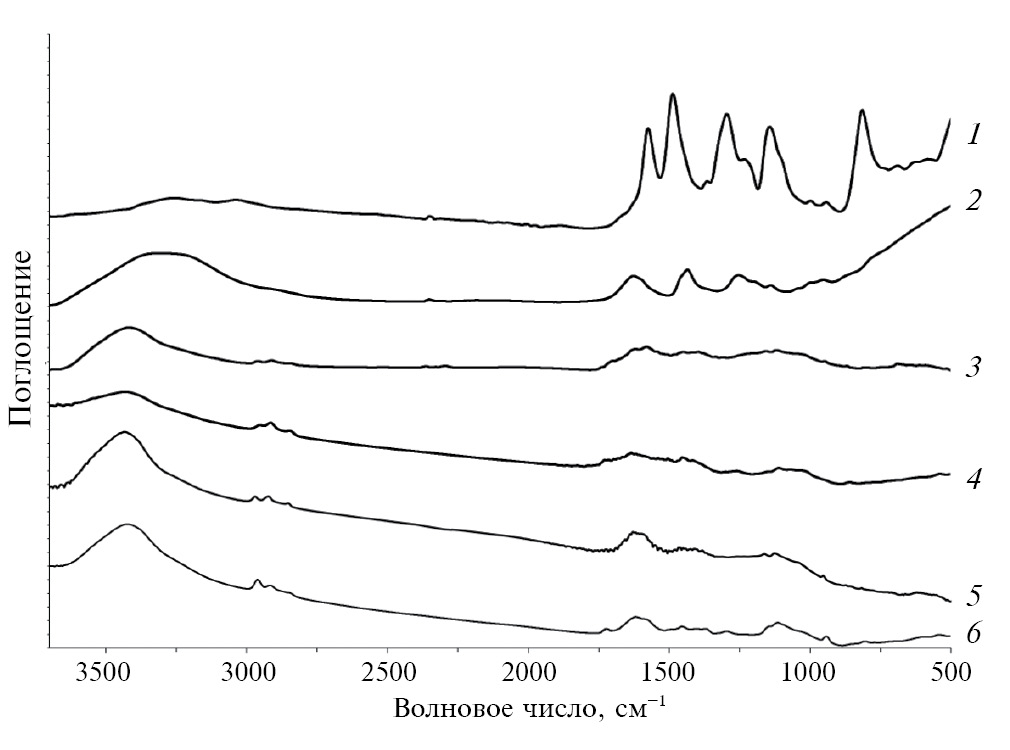 Рис. 5. ИК-спектры исходных и полученных материалов: 1 – ПАНИ; 2 – ФФС; 3 – о-УНТ; 4 – в-ОГ; 5 – карбонизированный криогель; 6 – криогель.