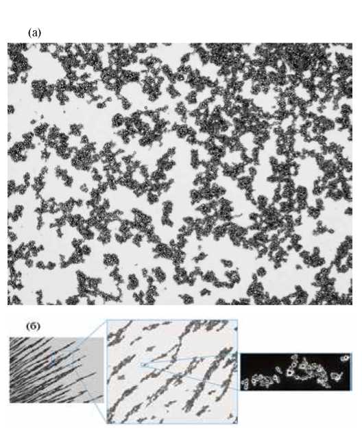 Под действием сильного магнитного поля (более 0.3 Тл) в рабочей зоне вязкость магнитореологической суспензии возрастает более чем в тысячу раз, и она как бы “замерзает”, разделяясь при этом на два слоя: первый – структурированные, нежестко связанные между собой ферромагнитные частицы, и второй – жидкая фаза с наноабразивом. Разность скоростей движения основы полировального инструмента и обрабатываемой детали создает сдвиговые деформации в МРС, что позволяет уносить с поверхности тончайшие слои материала (рис. 9а). После снятия магнитного поля МРС возвращается в свое первоначальное неструктурированное состояние. Это характеризует ее как smart-материал, а процесс – как быстропротекающий.