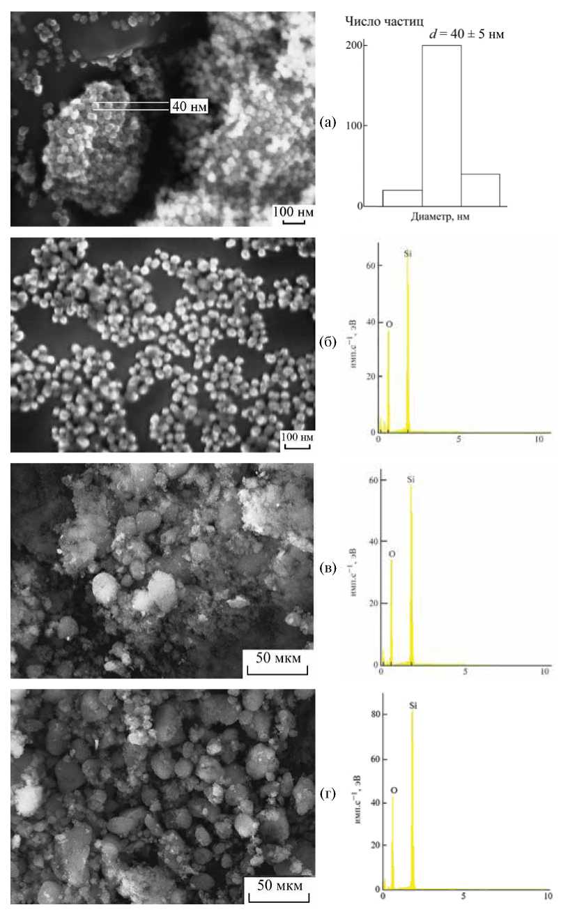 На рис. 4а–г представлены микрофотографии СЭМ и результаты энергодисперсионного анализа (ЭДА) образцов кремнезема. Исследования морфологической структуры пирогенного “Аэросила” марки А-300 (рис. 4в) и аморфного кремнезема марки “Полисорб” (рис. 4г) показали, что частицы кремнезема образуют глобулы различного размера и неправильной формы, собранные в агломераты. Степень чистоты полученных образцов анализировали посредством ЭДА. На вставках на рис. 4 представлены суммарные спектры локального элементного анализа изученных образцов.
