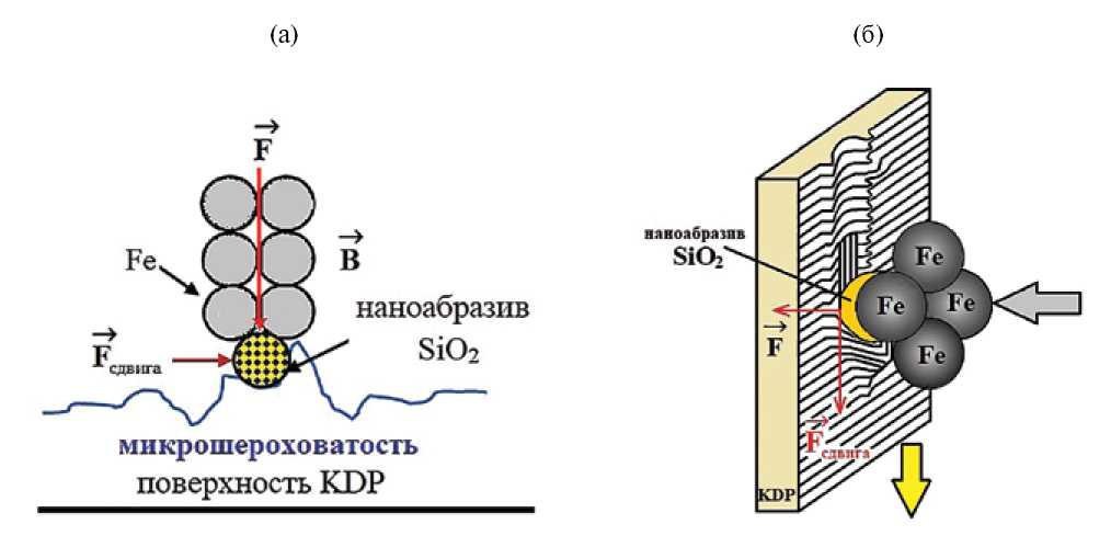 Рис. 9. Схематическое представление механизма действия наноабразива SiO2 при магнитореологическом полировании поверхности монокристалла KDP: унос с поверхности тончайших слоев материала (а); вдавливание наноабразивных частиц в поверхностные слои материала (б).