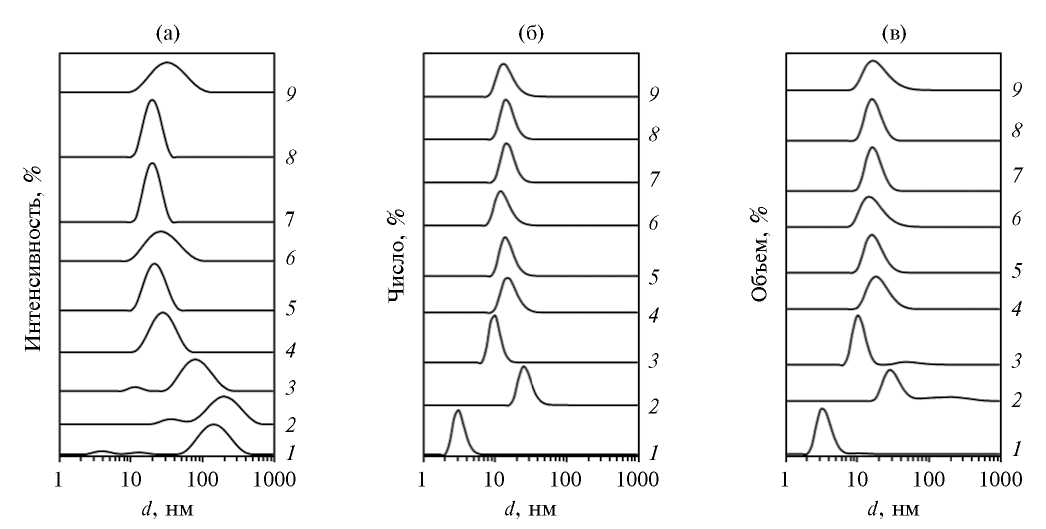 Рис. 1. Распределение по размерам в растворе P123 при варьировании температуры (1 – 15°C, 2 – 17°C, 3 – 20°C, 4 – 21°C, 5 – 25°C, 6 – 30°C, 7 – 35°C, 8 – 40°C, 9 – 45°C): а) по интенсивности рассеяния; б) по числу частиц; в) по объему.