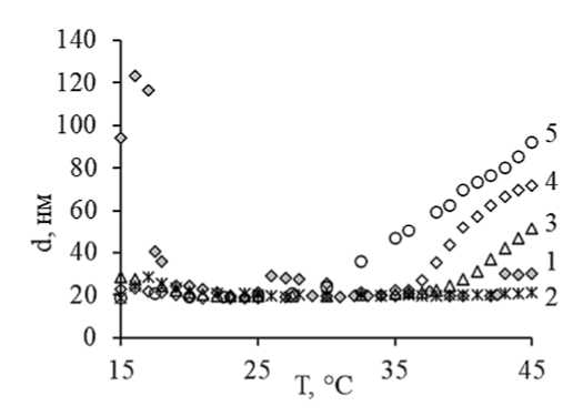 Рис. 2. Зависимость среднего гидродинамического диаметра от температуры при варьировании соотношения n(BuOH) : n(P123) : 1 – 0; 2 – 40 : 1; 3 – 60 : 1; 4 – 80 : 1; 5 – 160 : 1.